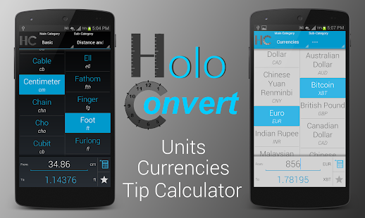 HoloConvert is the newest and best-looking unit conversion app for Android! Packed with features and designed to be easy to use, HoloConvert replaces the outdated looks of other unit conversion apps while integrating many features, such as currency rates updated from the internet, a tip calculator, saving favorite conversions, and more.
